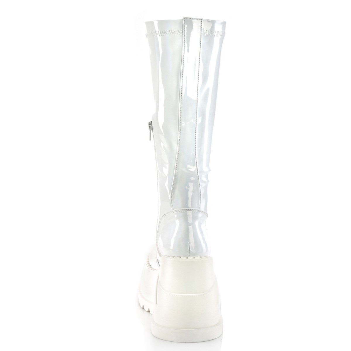 Demonia - STO200/WHGPT - 4 3/4 "" (12cm) Wedge Plateausohle, Alternative Damenstiefel Keilabsatz Plateau mit Prägungen. Kniehohe Plateaustiefel mit Elastische Stiefelschaft und schimmernde Hologramm Optik, Rückseite geschlossene Ferse Vorderseite geschlossene Zehenpartie. Das Fussbett ist gepolstert mit Innensohle für hohen Tragekomfort. Cyberpunk Goth Festival Rave Punk Lolita Grunge Emo Gruftie Disco Style Platform Stiefel, Weiße Stretch Obermaterial gefertigt aus Vegane Vinylleder mit Holographische Regenbogen Effekt. Reißverschluss befindet sich Seitlich in halbhohe Schafthöhe. Pleaser Demonia Stiefel sind mit liebe hergestellt!
