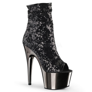 Pleaser - ADO1008SQ/B/PWCH - 7" (178mm) stiletto high heel, 2 3/4" (70mm) pewter chrome platform heel, sequin ankle boots high heels with chrome-plated platform sole. Ankle-high boots for women, shaft end and toe area with contour made of patent stripes, closed heel at the back, open toe area at the front. The footbed is padded with an insole for high wearing comfort. Black upper made of vinyl leather covered with metallic sequins. Zipper is on the side over the entire shaft height. Perfect pole dance boots. Exotic GoGo dance shoes! Pleaser high heels are made with love...
