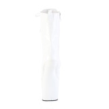 8" (200mm) heelless heel, 3" (76mm) pony platform, ankle-high ankle boots with laces through metal eyelets. Shiny ankle boots with pony platform sole and removable clip heel. The heels on these ankle boots can be removed with a click or extended into a wedge heel. Closed heel at the back, closed toe at the front. Unusual platform lace-up boots with heelless heel, pull tab on the back. The footbed is padded with an insole for high wearing comfort. White upper made of shiny patent leather. Zipper is on the side along the entire shaft height. Pleaser boots are made with love!