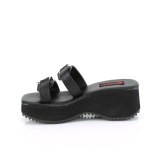 1/2" (6.4 cm) black platform heel, double strap sandals mules designed with two velcro straps. Women's mules with thick platform sole, strap decorated with chrome rings in heart shape. The footbed is padded with insole for high wearing comfort. Festival Rave Goth Punk Lolita Grunge Emo Cyberpunk Cosplay Alternative Style Mules Mules, black upper made from vegan vinyl leather materials. Pleaser Demonia shoes are made with love!