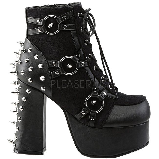 Demonia - CHA100/BVL-SUE - 4 1/2" (11.4cm) high block heel, 2" (5.1cm) black platform, ankle-high boots with laces through chrome-plated eyelets. Ankle boots outside with triple harness straps attached with flat rivets connected to metal rings, ring center decorated with chrome-plated spike rivets. Alternative lace-up boots with thick platform sole and high block heel, heel and heel back modeled with chrome-plated spike rivets and flat rivets. Closed heel at the back, closed toe at the front. The footbed is padded with an insole for high wearing comfort. Festival Rave Goth Punk Lolita Grunge Emo Cyberpunk Cosplay Alternative Style Platform Ankle Boots for Women, Black upper made of vinyl leather and faux suede. Metal zipper is located on the side along the entire shaft height. Pleaser Demonia Boots are made with love!