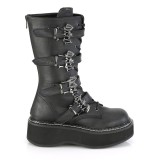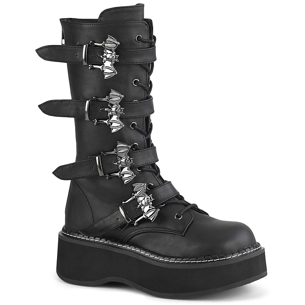Demonia - EMI322/BVL - 2" (51mm) black platform heel, mid calf platform boots with lace-up front, four straps with adjustable buckle closure decorated with batwing buckles. The footbed is padded with insole for high wearing comfort. Festival Rave Goth Punk Lolita Grunge Emo Cyberpunk Cosplay Alternative Style lace-up boots, upper made of vegan vinyl leather. Heel zipper is located on the back over the entire heel height. Pleaser Demonia shoes are made with love!
