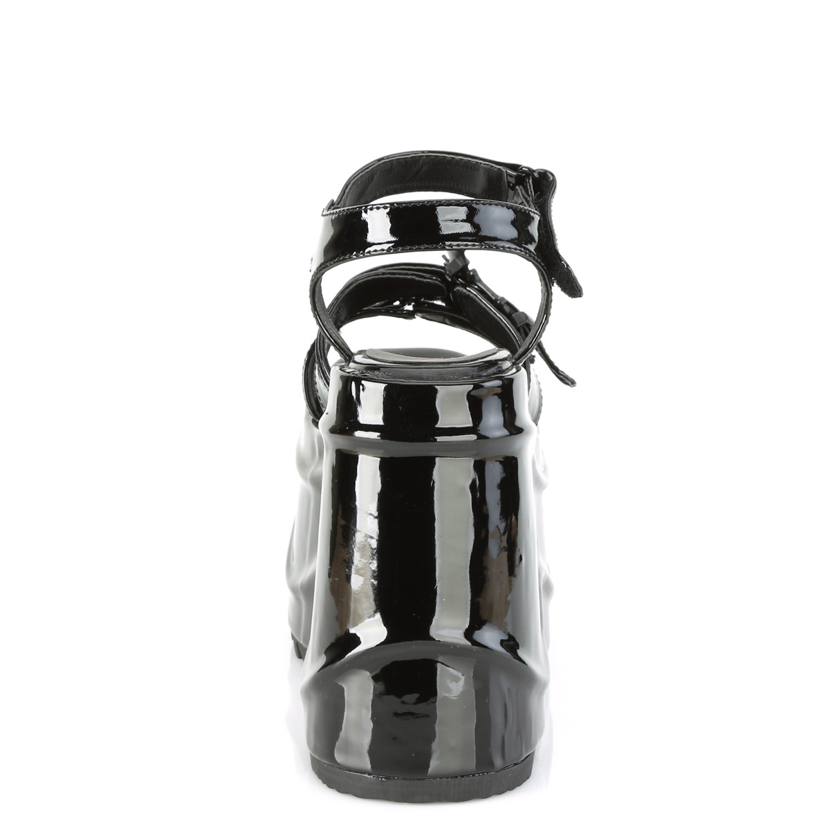 Demonia - WAVE13/B - 6" (152mm) thick wedge platform sole, shiny wedge heel platform sandals with adjustable velcro straps. Wedge sandals platform heel with contour designed in wave shape. Back open heel, front open toe modeled with double strap and adjustable velcro fastener, middle strap decorated with bat amulet. The footbed is padded with insole for high wearing comfort. Women's shoes wedge sandals, festival rave goth punk lolita grunge emo cyberpunk cosplay alternative wedge platform shoes, black upper made of shiny patent leather. Pleaser Demonia shoes are made with love!