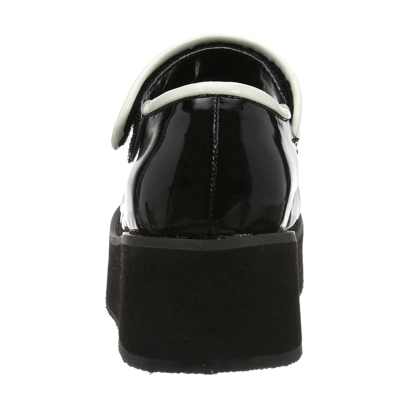 1/4"" (57mm) black platform heel, Mary Jane platform pumps with thick platform sole. Festival Rave Goth Punk Lolita Grunge Emo Cyberpunk Cosplay Alternative Style pumps, adjustable ankle strap with black snap fastener. Strap decorated with white contrast stripes, closed heel at the back, round toe at the front. The footbed is padded with an insole for high wearing comfort. Women's pumps, black upper made of shiny patent leather. Pleaser Demonia shoes are made with love...