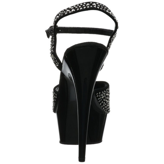 Pleaser - DEL609RS/BS-PWRS/M - 6 "" (152mm) high heel, 1 3/4 "" (45mm) black platform heel, sandals with adjustable ankle strap decorated with rhinestones, front open toe, back open heel. Elegant women's high heels with platform and padded insole. Black upper decorated with rhinestones and made of vegan faux suede. Pleaser sandals are made with love, perfect pole dance shoes!