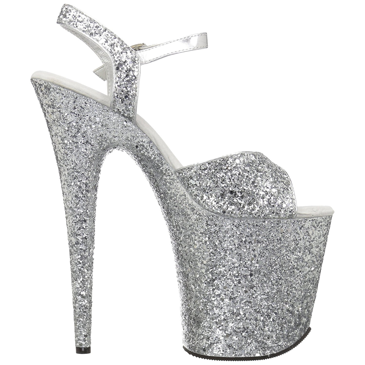 Pleaser - FLAM810LG/SG/M - 8"" (200mm) extreme high heel, 4"" (100mm) silver glitter platform heel, sandals with adjustable ankle strap and buckle closure. High heels platform sole filled with glittery dots, open toe at the front and open heel at the back. The footbed is padded with an insole for high wearing comfort. Very high women's high heels, silver upper made of vegan vinyl leather covered with glitter dust. Perfect pole dance shoes, exotic GoGo dance shoes! Pleaser high heels shoes are made with love...
