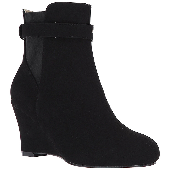 Pleaser Pink Label - KIM102/BNBSUE - 3 "" (7.6 cm) Classic wedge ankle boots, large wedge heel boots with low heel and side stretch insert, decorative strap on the shaft end, closed heel at the back and closed toe at the front. Classic wedge boots for large feet 39, 40, 41, 42, 43, 44, 45, 46, large elegant ankle boots with padded insole for high wearing comfort. Black upper made of vegan vinyl leather covered with velour fabric. Pleaser Pink Label boots are made with love! Also suitable for men, women, drag queens, crossdressers, trans men or trans women.