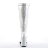 Funtasma - GOGO300X/W - 3" (7.6 cm) white block heel, knee-high boots with elastic shaft width for large feet. Gogo boots extra wide boot shaft for strong calves. Knee boots for large sizes 39, 40, 41, 42, 43, 44, 45, 46, Gogo patent boots with low block heel and flat sole, back closed heel, front closed toe area. The footbed is padded with an insole for high wearing comfort. 70s vintage flower power disco hippie ABBA style gogo boots, white stretch upper made of shiny patent leather. Zipper is on the side over the entire shaft height. Pleaser Funtasma boots are made with love! Also suitable for men, women, trans men or trans women.