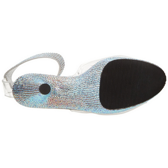 Pleaser - BEJ712RS/C/SMCRS - 7" (178mm) stiletto heel, 2 3/4" (70mm) silver rhinestone platform, transparent mules high heels, removable ankle cuff with velcro fastener, entire cuff decorated with rhinestones. Extravagant mules, silver glittering platform sole and heel covered with around 10,500 rhinestones, individually worked in by hand. The footbed is padded with an insole for high wearing comfort. Platform women's shoes mules for home or parties, upper material made of transparent vinyl film. Pleaser high heels shoes are made with love!
