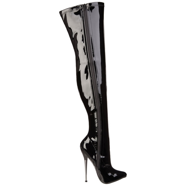 Devious - DAG3000/B - 6 1/4 "" (15.9cm) stiletto high heels, fetish overknee boots with spike stiletto metal heel. Pointed-toe overknee patent leather boots for fetish parties, back closed heel, front pointed toe. Domina stilettos high heels overknees with elastic boot shaft, the footbed is padded with an insole for high wearing comfort. Domina overknees women's boots stilettos, black stretch upper made of shiny patent leather. Pleaser Devious stiletto boots are made with love!