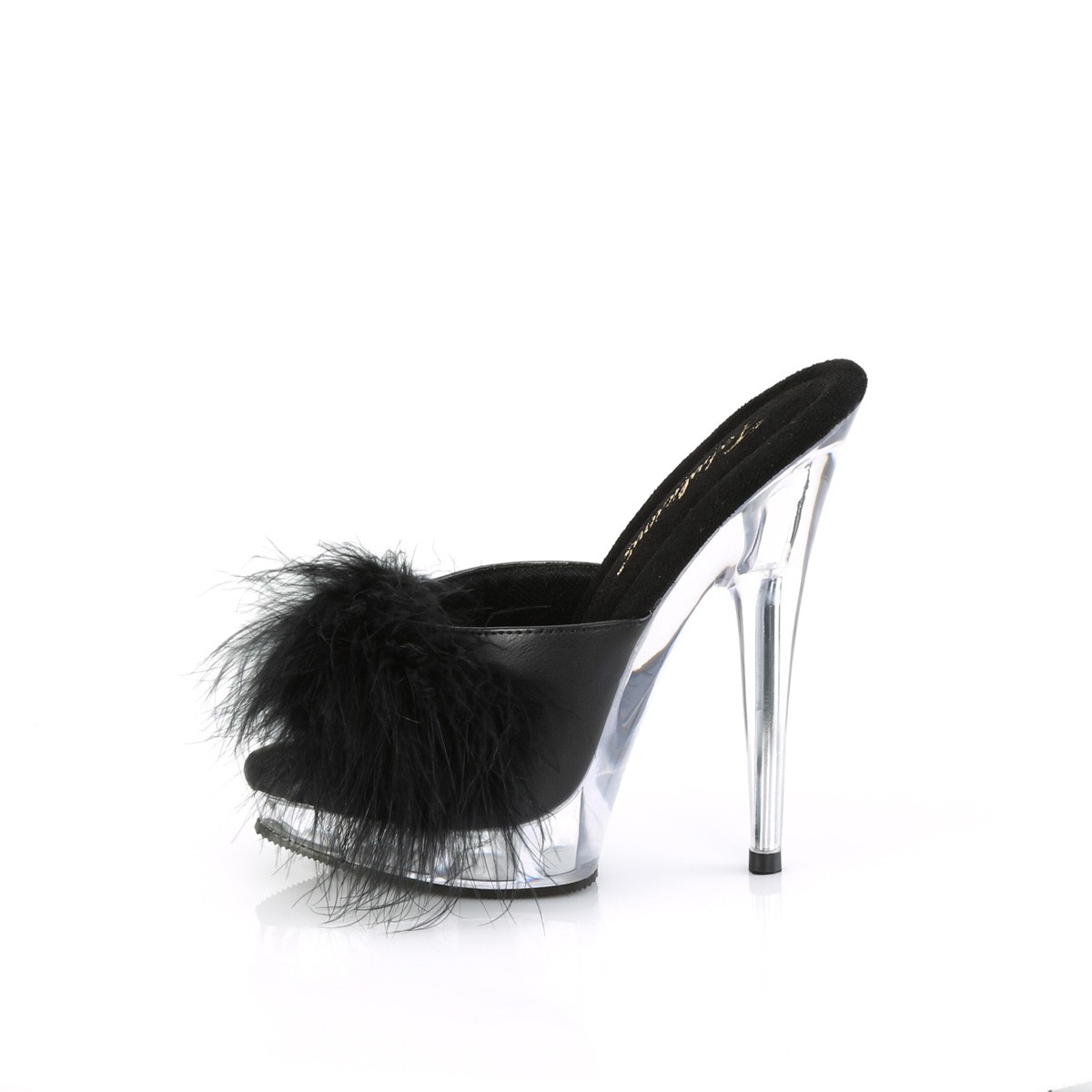 Fabulicious - SUL601F/BPU - 6" (152mm) High Heel Absatz, 1" (25mm) Transparente Plateauabsatz, Schwarze Mules High Heels mit Schmale Plateau aus Acrylglas, Vorderseite offene Zehenpartie mit Marabou Federn. Das Fussbett ist gepolstert mit Innensohle für hohen Tragekomfort. Damen Pantoletten Mules für Zuhause oder Partys, Schwarze Obermaterial gefertigt aus Vegane Vinylleder. Pleaser Fabulicious High Heels Schuhe sind mit liebe hergestellt!
