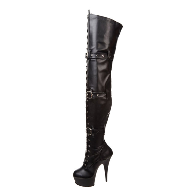 Pleaser - DEL3028/B/PU - 6 "" (152mm) High Heel Absatz, 1 3/4 "" (45mm) Plateauabsatz, Overknee Schnürstiefel High Heels mit Plateau, Rückseite geschlossene Ferse Vorderseite geschlossene Zehenpartie. Schnür Overknee Stiefel mit Breite Schnürsenkel durch Metallösen. Seitlich Drei Riemen mit große Schnallen, Riemen verziert mit Metallösen. Schwarze Obermaterial gefertigt aus Vegane Vinylleder. Reißverschluss befindet sich Seitlich am gesamten Stiefellänge. Pleaser Overknees sind mit liebe hergestellt!