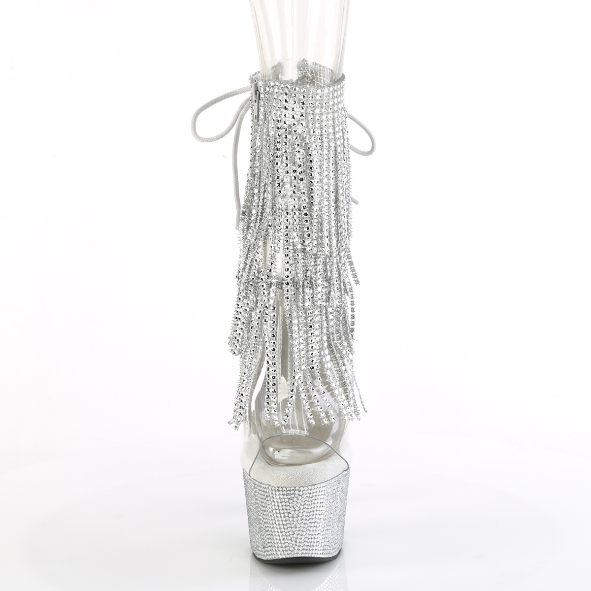 7" (178mm) Stiletto Absatz, 2 3/4" (70mm) Silberne Strass Plateau, Glitzernde Stiefeletten Stiletto High Heels und Plateausohle umhüllt mit Strasssteinen. Vorderseite offene Zehenpartie Rückseite offene Ferse mit Schnürsenkel. Knöchelhohe Boots, Das Fussbett ist gepolstert mit Innensohle für hohen Tragekomfort. Glitzernde Platform Schnürboots, Schaft modelliert mit Vier gestaffelte Fransen aus Strasssteinen. Obermaterial gefertigt aus Durchsichtige Vinylfolie. Reißverschluss befindet sich Seitlich an gesamte Schafthöhe. Perfekte Pole Dance Boots, Exotic GoGo Tanzschuhe! Pleaser High Heels Boots sind mit liebe hergestellt!