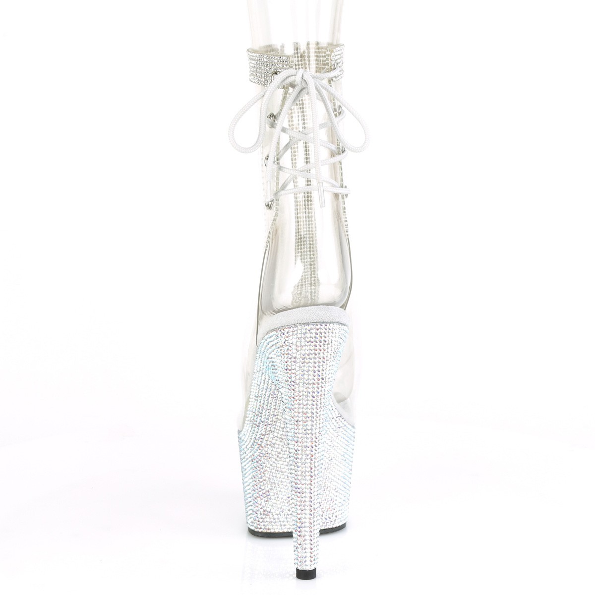 Pleaser - BEJ1018C-2RS/C/SRS - 7" (178mm) Stiletto Absatz, 2 3/4" (70mm) Silberne Strass Plateau, Transparente Stiefeletten Stiletto High Heels und Plateausohle umhüllt mit Strasssteinen. Vorderseite offene Zehenpartie Rückseite offene Ferse mit Schnürsenkel, Das Fussbett ist gepolstert mit Innensohle für hohen Tragekomfort. Knöchelhohe Boots für Damen, Vorderseite und Schaftende dekoriert mit Strass Streifen. Obermaterial gefertigt aus Durchsichtige Vinylfolie. Perfekte Pole Dance Boots, Exotic GoGo Tanzschuhe! Pleaser High Heels Boots sind mit liebe hergestellt...