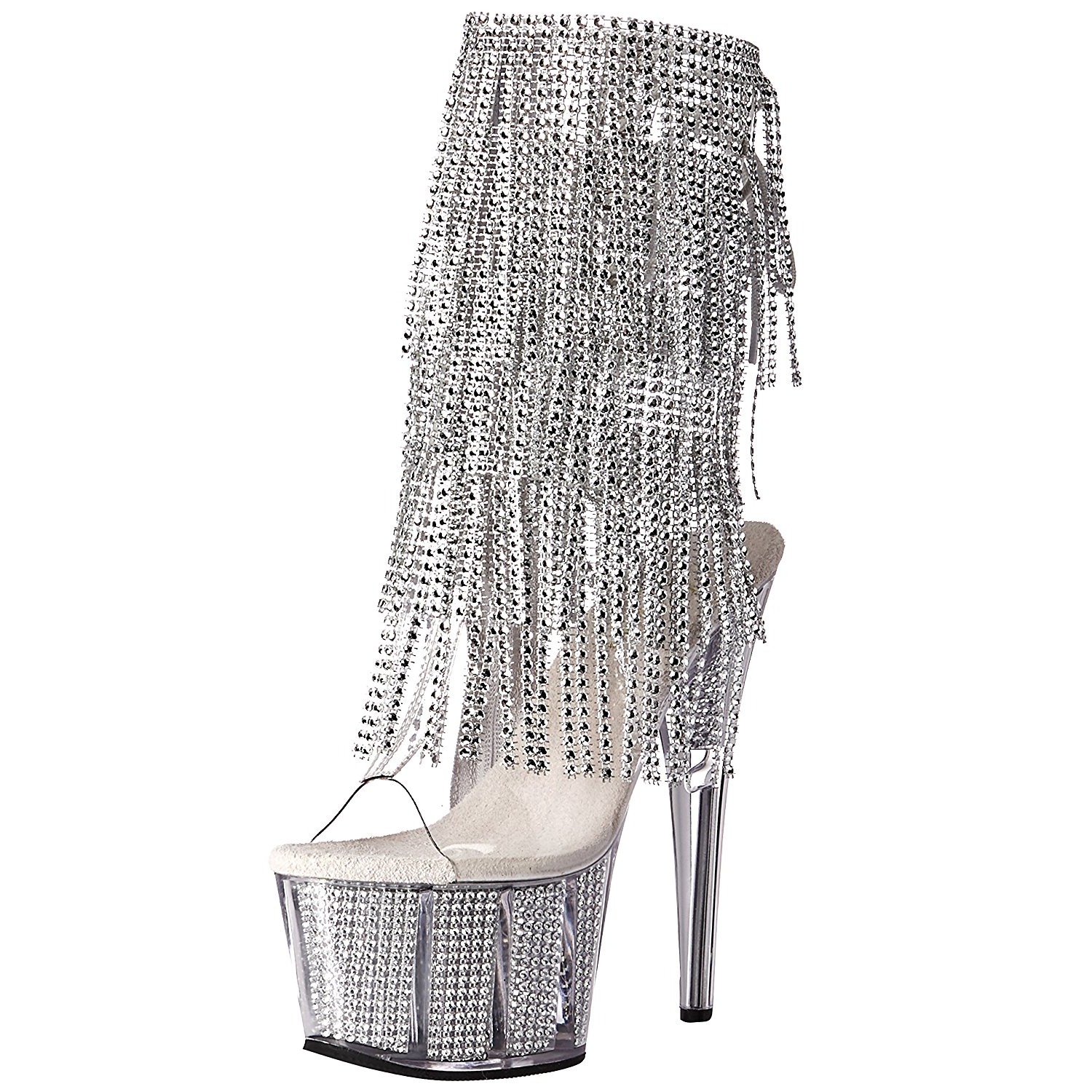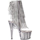 Pleaser - ADO1017SRS/C-S/S - 7" (178mm) Stiletto High Heel Absatz, 2 3/4" (70mm) Transparent Silberne Plateauabsatz, Glitzernde Stiefeletten High Heels mit Acrylglas Plateausohle gefüllt mit Strass Steinen, Vorderseite offene Zehenpartie Rückseite offene Ferse mit Schnürsenkel. Knöchelhohe Platform Boots, Das Fussbett ist gepolstert mit Innensohle für hohen Tragekomfort. Damen Schnürstiefeletten Schaft modelliert mit Vier gestaffelte Fransen aus Strass Steinen, Obermaterial gefertigt aus Durchsichtige Vinylfolie. Reißverschluss befindet sich Seitlich an gesamte Schafthöhe. Perfekte Pole Dance Boots, Exotic GoGo Tanzschuhe! Pleaser High Heels Boots sind mit liebe hergestellt!
