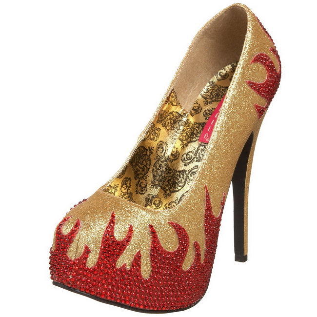 Bordello - TEE27/GR - 5 3/4 "" (14,6 cm) Absatz, 1 3/4 "" (4,5 cm) Versteckte Plateauabsatz, Glitzernde Plateaupumps für Damen mit Rote Strass Steinenen bedeckte Flammen Muster. Rückseite geschlossene Ferse Vorderseite geschlossene Zehenpartie. Das Fussbett ist gepolstert mit Innensohle für hohen Tragekomfort. 50er Jahre Pinup Burlesque Retro Vintage Vogue Cosplay Rockabilly Style, Strass Pumps High Heels mit Plateausohle, Goldene Obermaterial gefertigt aus Vegane Vinylleder mit Glitzerstaub umhüllt. Pleaser Bordello Schuhe sind mit liebe hergestellt!